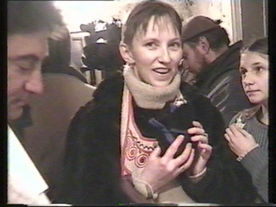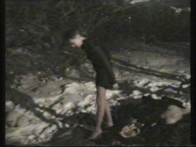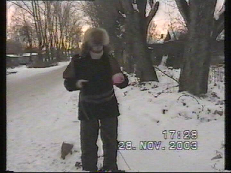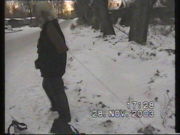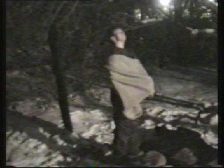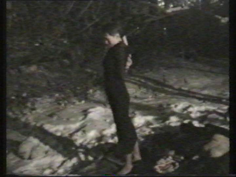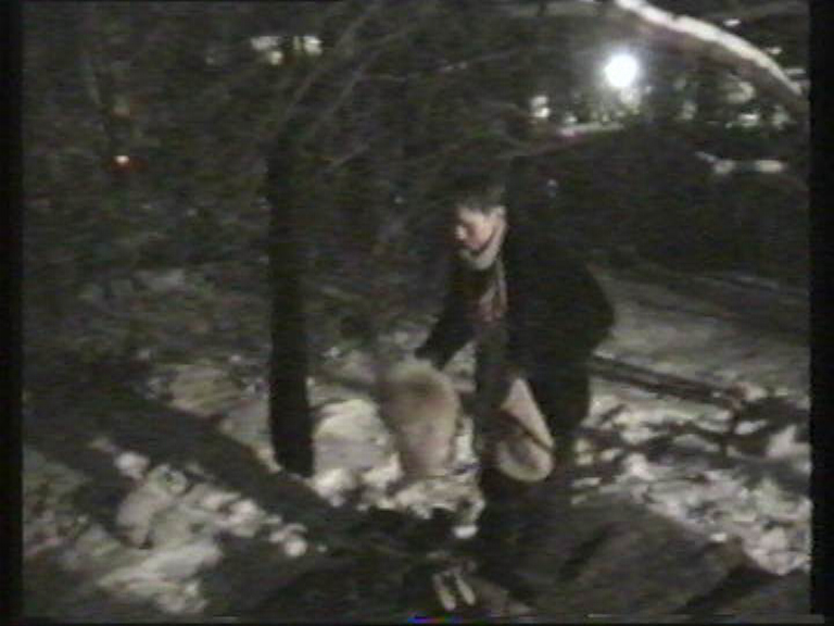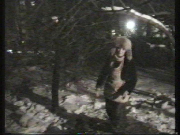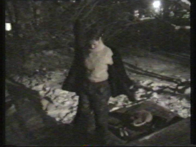 От автора: “В этот день у меня было два дела почти одновременно. Одно – в Доме Елового, другое довольно пафосное – в Доме Актера. Благо, что от ДЕ до ДА всего 13 минут пешком. В надежде успеть на оба мероприятия, я решила сделать этот перформанс в саду. В ноябрьский морозный вечер я была одета как капуста – полушубок, свитер, ватные штаны. Стоя на снегу среди голых яблонь я переоделась в вечернее бархатное платье с люрексом, надела капроновые колготки и туфли на каблуке. Последний штрих – парик – завершил метаморфозу. Я везде успела…”