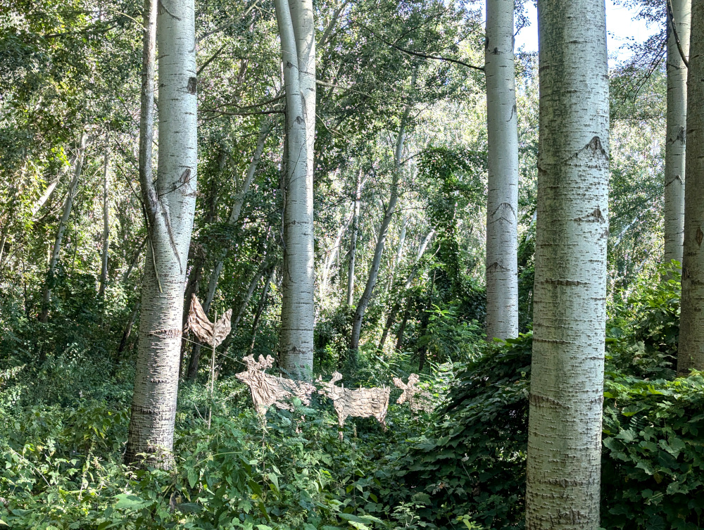 JELEN|ÉS (Transition and Interaction): Suspended between trees, the deer symbolize the passage between different states — earth and sky, present and future. The moon-boat complements the image of a journey and connection between worlds, pointing to the cyclical and continuous processes in nature and culture. They exist in a state of “in-between” — between visible and invisible, real and illusory. Their presence embodies the transition from one state to another, and in this transition, the viewer plays an important role by activating the object through attention, making it meaningful. In this sense, “Flying Deer” are an embodiment of the transitional moment, a bridge between the visible world and the hidden world.
