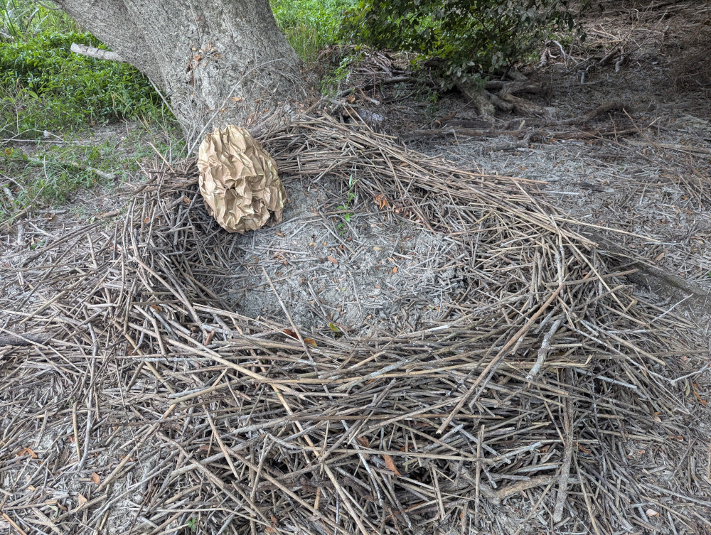 4. Между природой и человеческим творчеством: Создание гнезда из материалов, найденых в естественной среде, подчеркивает идею взаимодействия между природой и человеческим творчеством. Человек в оленьей маске действует как посредник между этими двумя мирами, связывая их в процессе создания. В этом смысле проект исследует состояние «МЕЖДУ» как пространство, где пересекаются и переплетаются природные и культурные элементы.