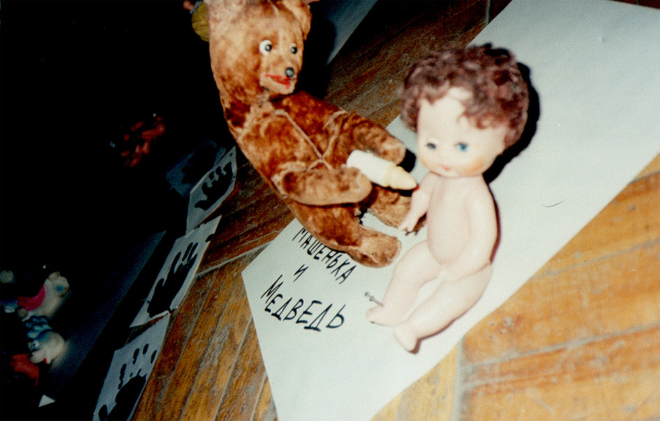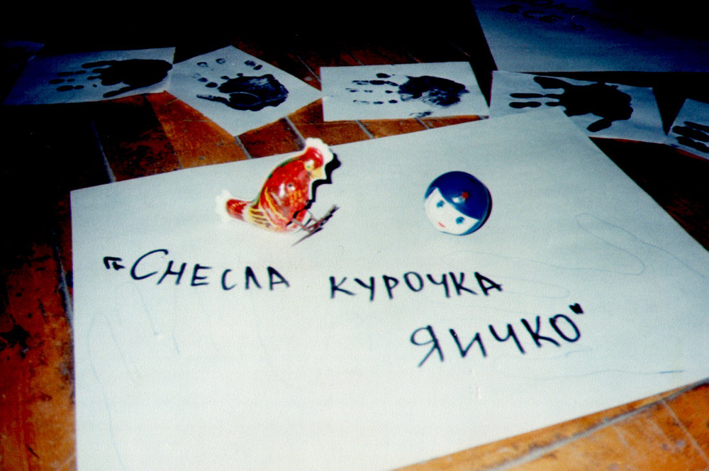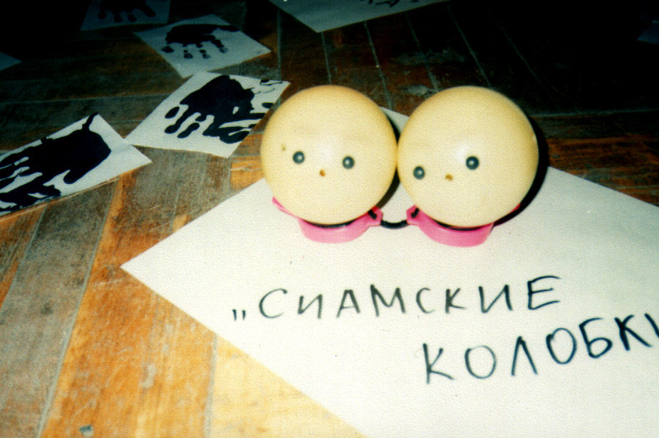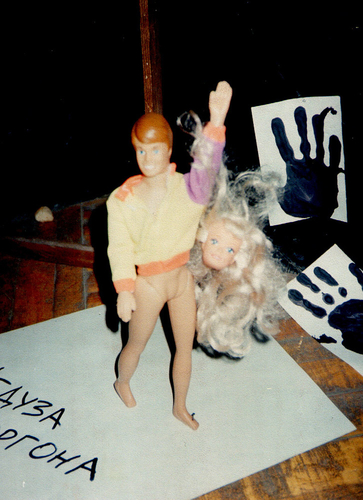 Эпизод первый был представлен в коллективном проекте «Простое дело», от Свердловской областной общественной организации художников “Галерейная позиция” на фестивале галерей АРТ-НОВОСИБИРСК в 2002 году. Часть пустой комнаты, где находятся вызолоченные скорлупки разбитого куриного яйца, лежащие на полу, рядом – силуэты, обведенные мелом. (мужской и женский – Бабки и Дедки).