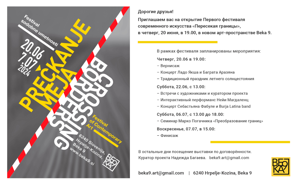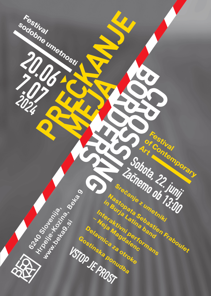 Выставочное пространство Beka 9, расположено в здании бывшей пограничной заставы, на границе Словении и Италии, рядом с живописной словенской деревушкой Бека, на пересечении культур, недалеко от реки, символически разделяющей два государства. Это уникальное место диктует тему фестиваля.