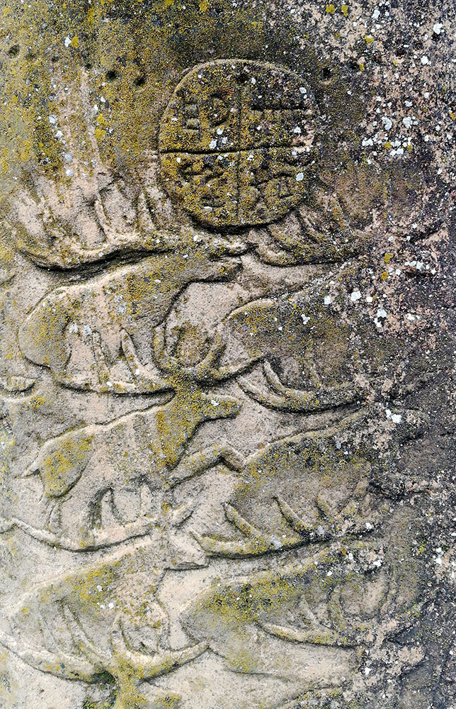 Carved from an 8-ton sandstone block that tapers toward the top, the sculpture is covered with animated scenes of life. Mythical and folkloric figures of humans and animals intertwine with gently swaying plants and trees. On the front side, a stag is depicted with a solar disk between its antlers. [1 2 ]