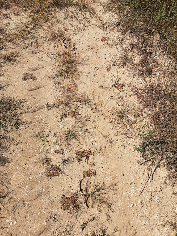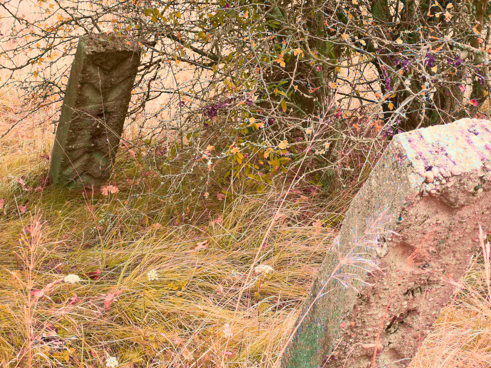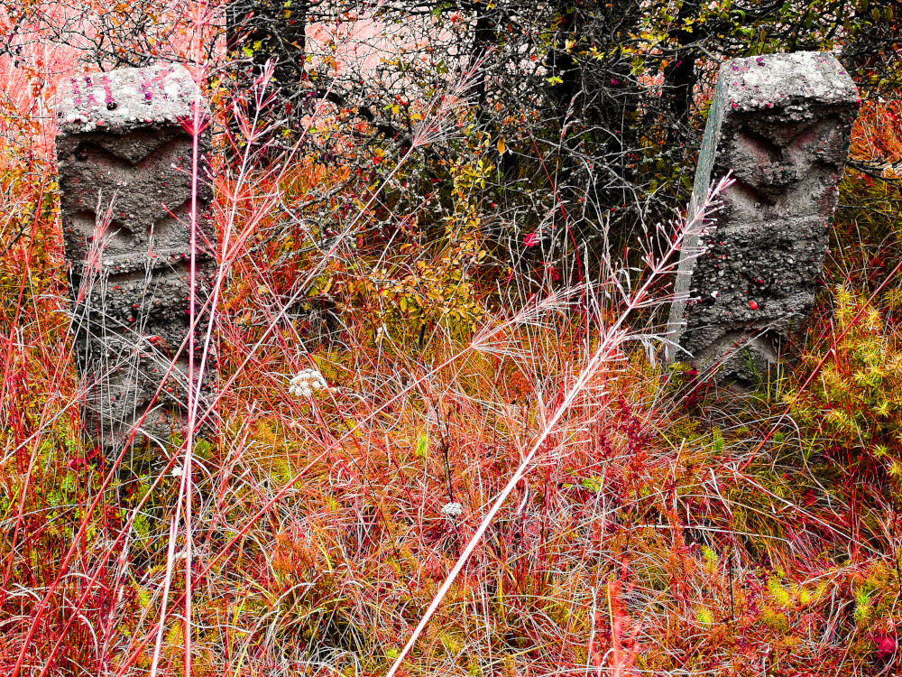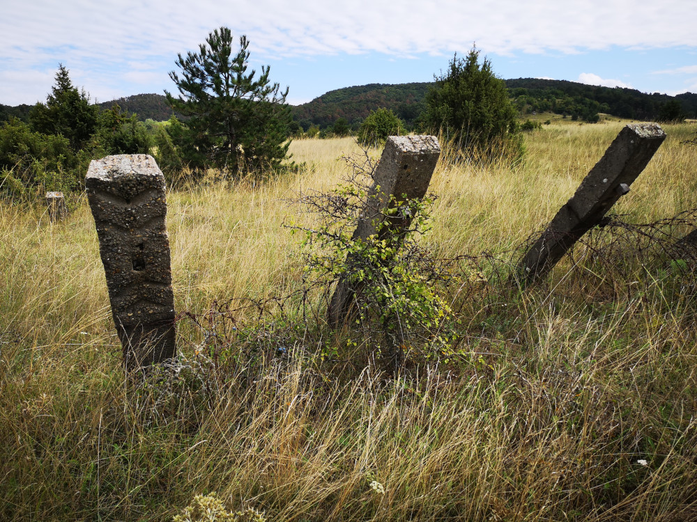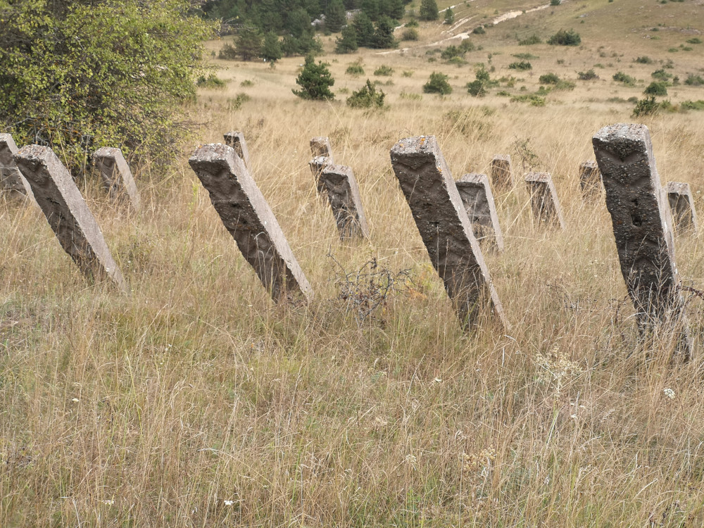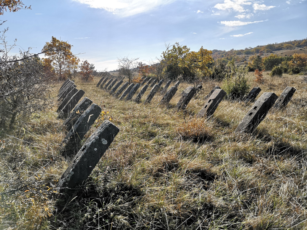 On a gentle hillside, we discovered rows of concrete posts embedded in the ground at an angle. While their original function is unclear, they are likely remnants of military engineering — possibly barriers or training obstacles from a former late-20th-century training ground.