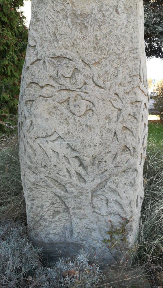 Carved from an 8-ton sandstone block that tapers toward the top, the sculpture is covered with animated scenes of life. Mythical and folkloric figures of humans and animals intertwine with gently swaying plants and trees. On the front side, a stag is depicted with a solar disk between its antlers. [1 2 ]