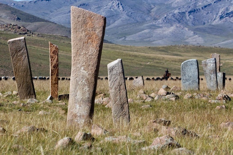 Deer Stones (Mongolian: Буган чулуун хөшөө) are stone stelae, often featuring anthropomorphic traits, with depictions of flying deer and other carvings. They range in height from 1 to 4.5 meters. These megaliths were created by ancient societies that existed between 1200 and 700 BCE in the territories of Mongolia and adjacent regions of Siberia.